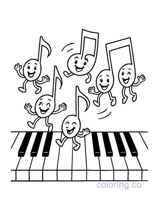 This page features smiling musical notes bouncing above a row of piano keys. Rounded outlines and light movement give it a cheerful, beginner-friendly theme.
